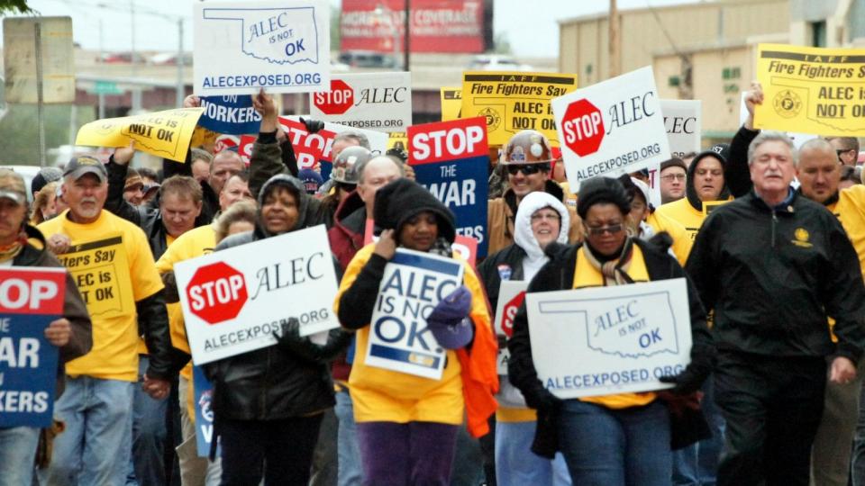 A new report reveals the American Legislative Exchange Council has pushed more than six dozen bills this year in 34 states that oppose renewable energy standards, support fracking and undermine environmental laws.